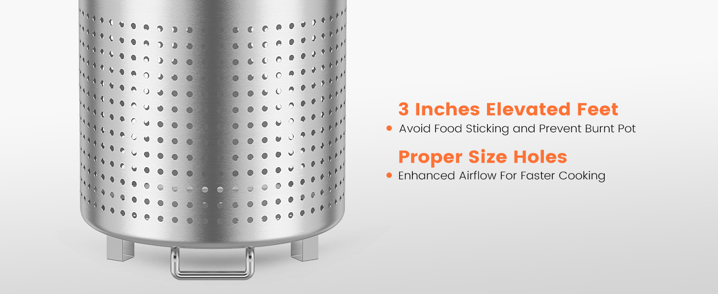 • EVEN HEATING & PREVENT STICKING: Raised 1.2 inches feet on the bottom of the basket to prevent the food from contacting the bottom of the stockpot. Baskets with proper size holes make it easier to even-heating, allowing food to cook faster and more thoroughly