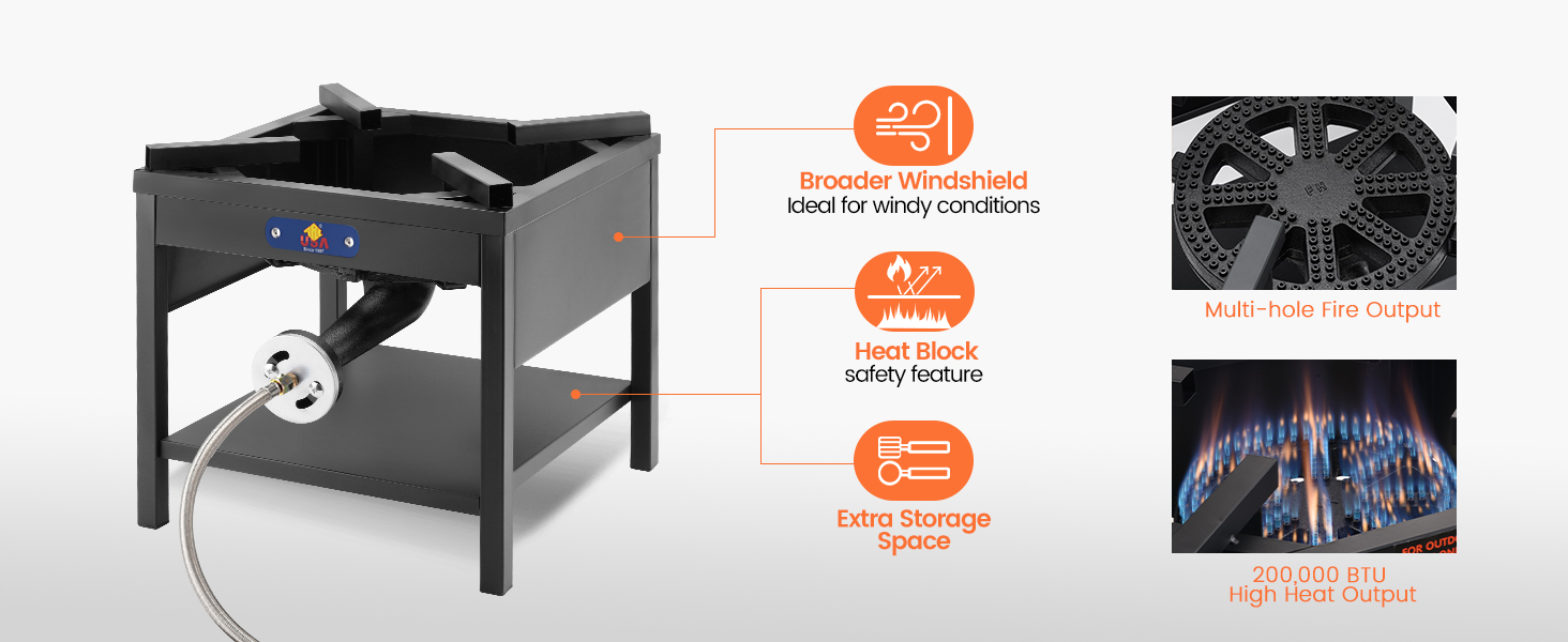 • NON-ASSEMBLY HIGH-PRESSURE BURNER: 200,000BTU Stired fry wok burner with large burner head provides fast and even heading. A pot of seafood can be boiled in 35 minutes. Ultra sturdy form can hold up to 200lb