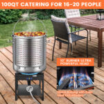 • LARGE CAPACITY CATERING 16-20 PPL: 100QT boil pot and 82QT basket can hold 52lbs of seafood or fry 4-6 turkeys at the same time. With 2 sheets of food-grade brown paper for easy serving. (L 43″X W 31″) . Premium Stainless Steel built to last and easy cleaning
