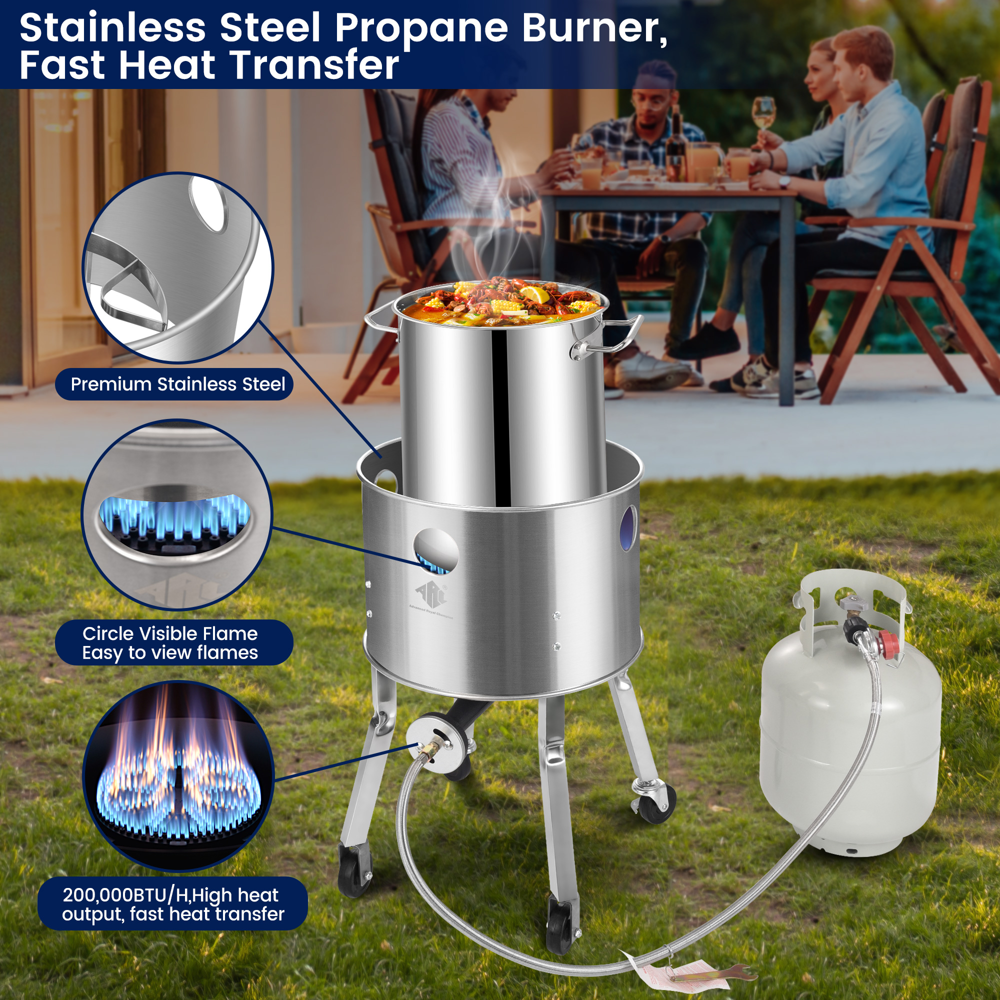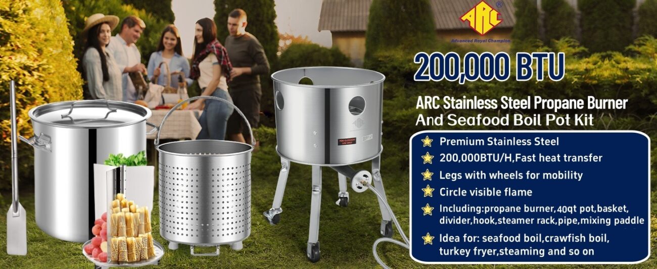 ARC Stainless Steel Steamer Pot With Portable Propane Burner For Outdoor Cooking, Seafood Crab-Vegetable-Tamale Large Pot with Water Spout, Divider and Steamer Rack, High Efficiency Stove