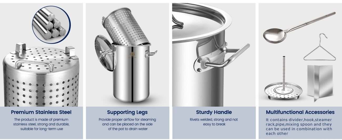 Stainless Steel Steamer Pot with Propane Burner for Outdoor Cooking – Large Pot with Water Spout, Divider and Steamer Rack (20QT-52QT)