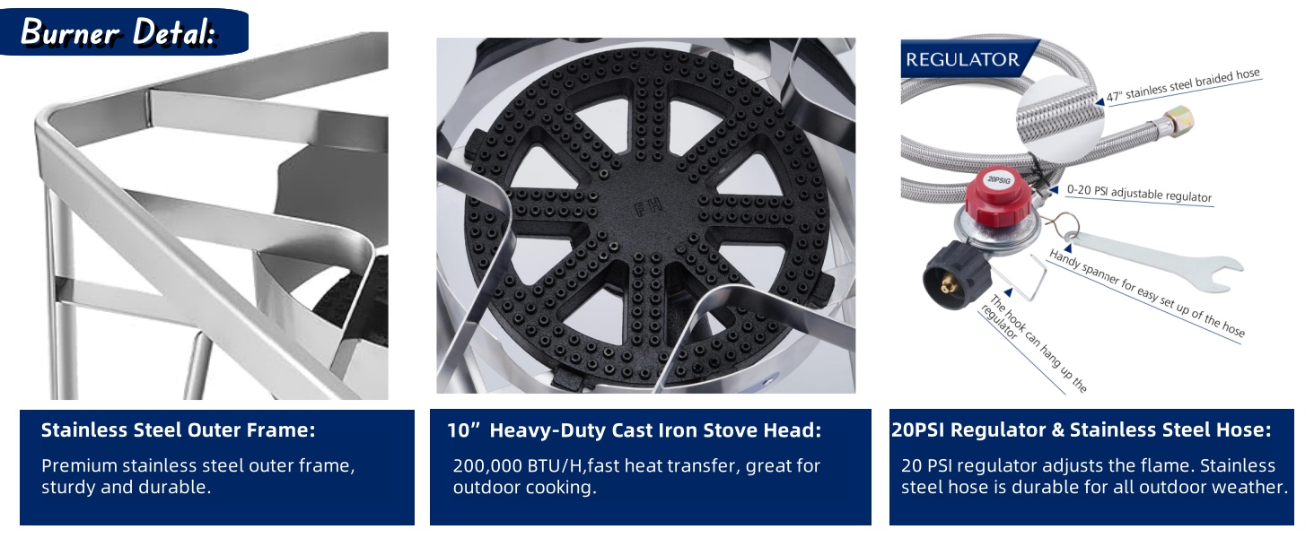 • Premium Stainless Steel: ARC turkey fryer pot , accessories, propane burner frame, and hose are all made of stainless steel for long-term use and durability. The burner has 200,000 BTU output, good enough to handle variant outdoor cooking needs such as crawfish boiling, turkey frying, steaming.