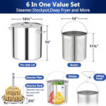 - Versatile Cooking Pot: The seafood boil pot is a great addition to your cooking equipment.Consists of 7 parts: pot, lid, strainer basket, lift hook, steamer rack, steamer tube and a divider.Make your favorite, traditional and delicious homemade recipes.