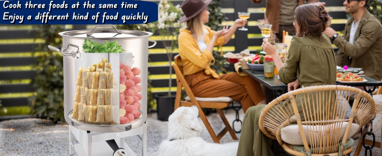 • Steaming capabilities with dividers, steam tubes, and racks for even heating. Great for seafood and tamale steaming.