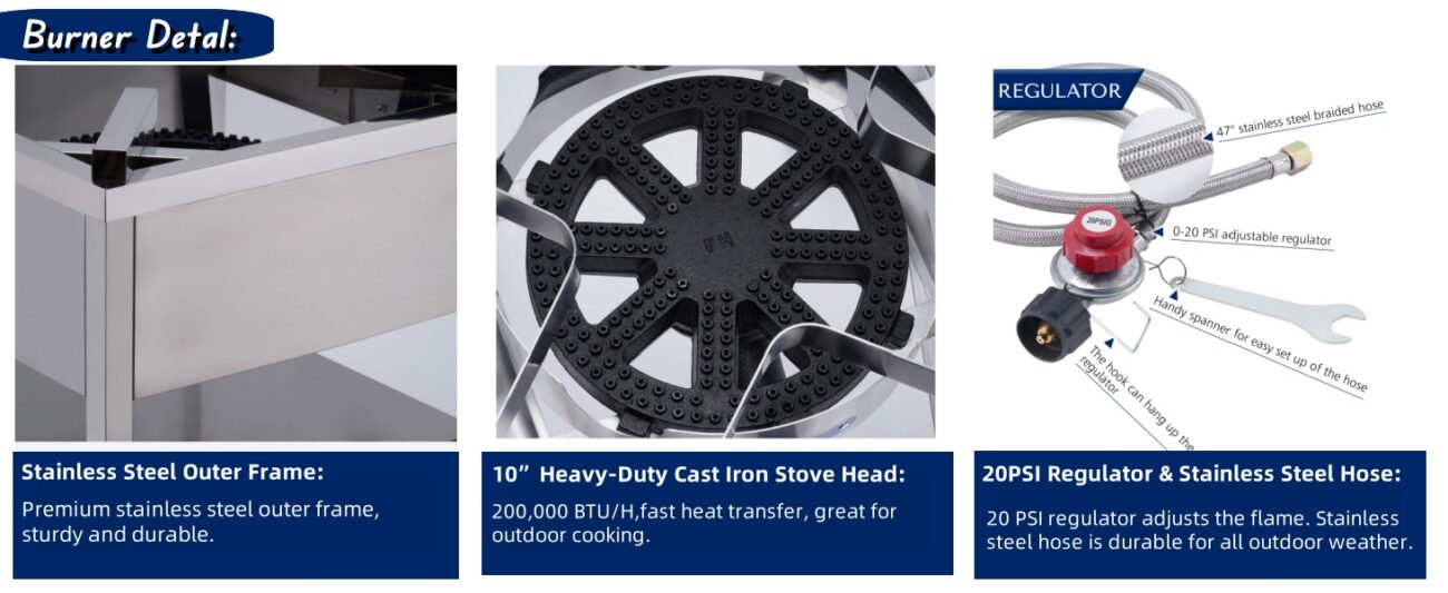 • Premium stainless steel construction for long-term durability. 200,000 BTU output burner for versatile outdoor cooking needs. Ideal for seafood boil pot and turkey fryer burner.
