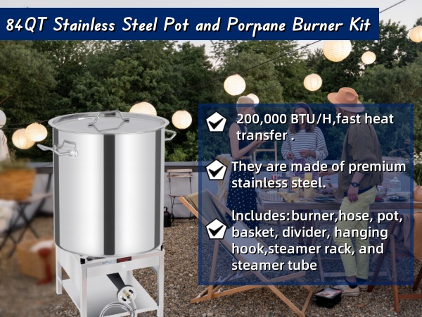 • Convenient package includes stainless steel propane burner, hose, 84 quart pot, basket, divider, hanging hook, steamer tube and steamer insert rack.