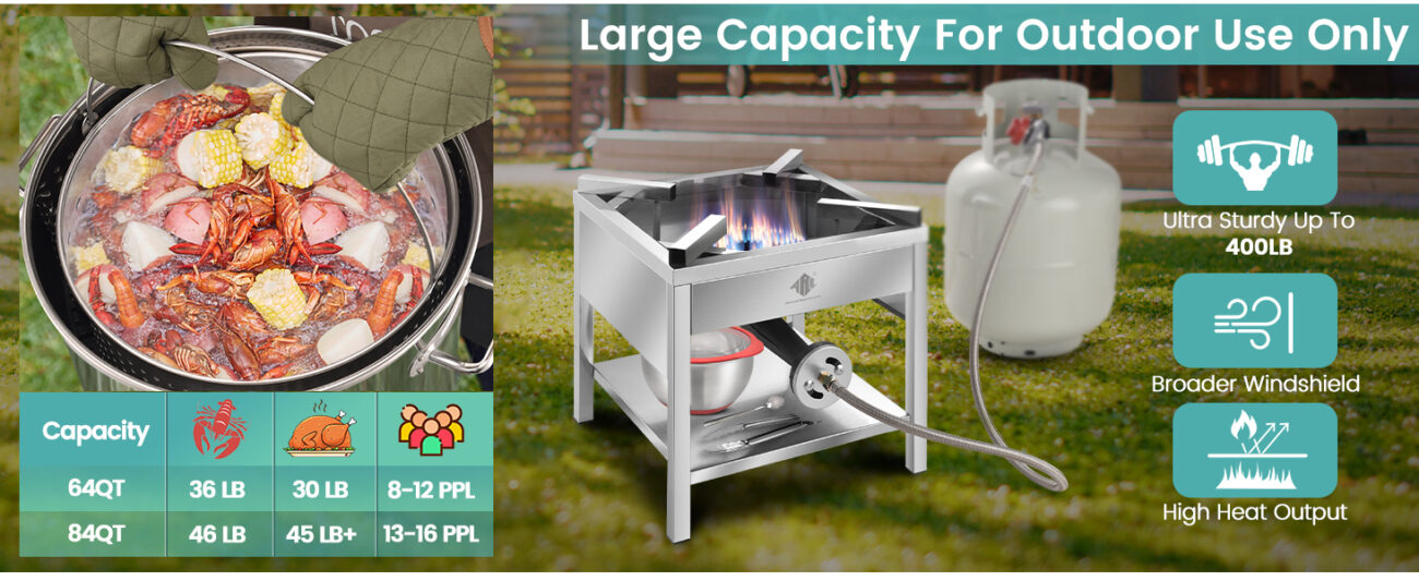 - NON-ASSEMBLY HIGH-PRESSURE BURNER: 200,000BTU Stired fry wok burner with large burner head provides fast and even heading. A pot of seafood can be boiled in 35 minutes. Ultra sturdy form can hold up to 200lb
