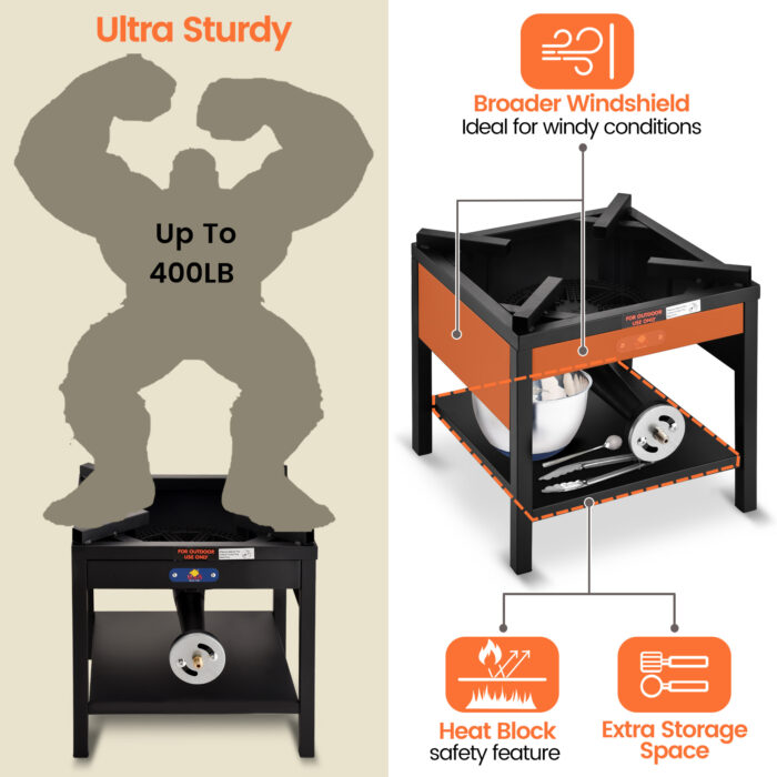 • NON-ASSEMBLY HIGH-PRESSURE BURNER: Cast Iron. 200,000BTU Stired fry wok burner with large burner head provides fast and even heading. A pot of seafood can be boiled in 35 minutes. Ultra sturdy form can hold up to 400lb.