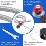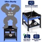 This outdoor propane burner has a reliable regulator hose, which ensures a leak-free, fully controlled burner experience. Measuring at 4ft, the burner is compatible with 20 lb propane tanks (QCC-Type 1), and fully adjustable, the propane regulator will allow users to max output with the turn of a knob.