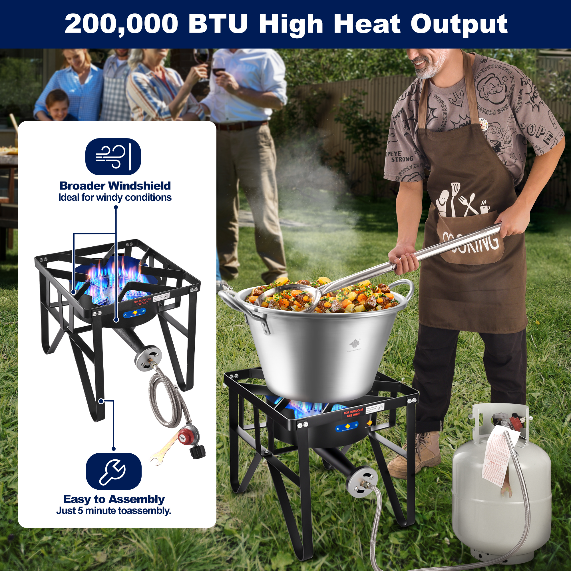 - LARGE BURNER: This outdoor cooking wok burner comes with a supersize 10″ cast iron burner and has a powerful 200,000 BTU high heat output, This is a powerful outdoor burner for heating up medium and larger pots and is a great tool for holding 20+ ppl party.