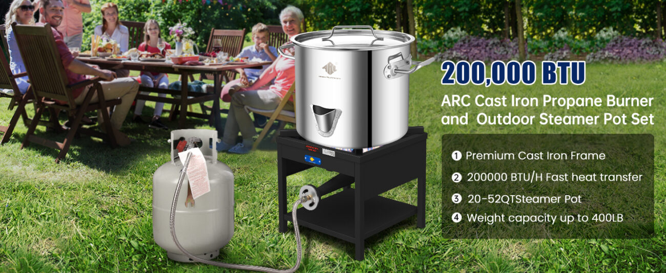 ARC Stainless Steel Steamer Pot With Portable Propane Burner For Outdoor Cooking, Seafood Crab-Vegetable-Tamale Large Pot with Water Spout, Divider and Steamer Rack, High Efficiency Stove