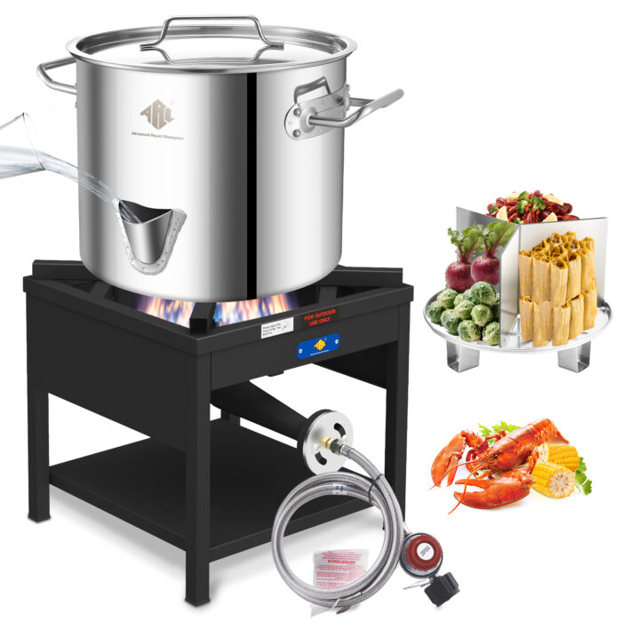 ARC Stainless Steel Steamer Pot With Portable Propane Burner For Outdoor Cooking, Seafood Crab-Vegetable-Tamale Large Pot with Water Spout, Divider and Steamer Rack, High Efficiency Stove