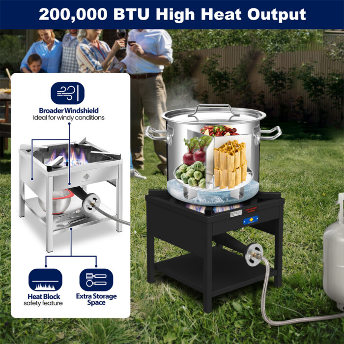 Stainless Steel Steamer Pot with Propane Burner for Outdoor Cooking – Large Pot with Water Spout, Divider and Steamer Rack (20QT-52QT)